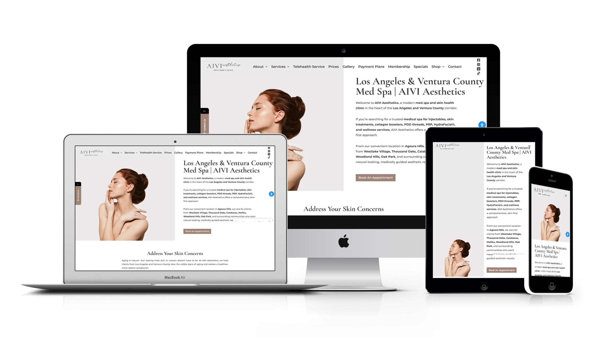 AIVI Aesthetics presents a modern med spa website highlighting injectables, skin treatments, wellness services, locations, and appointment booking.