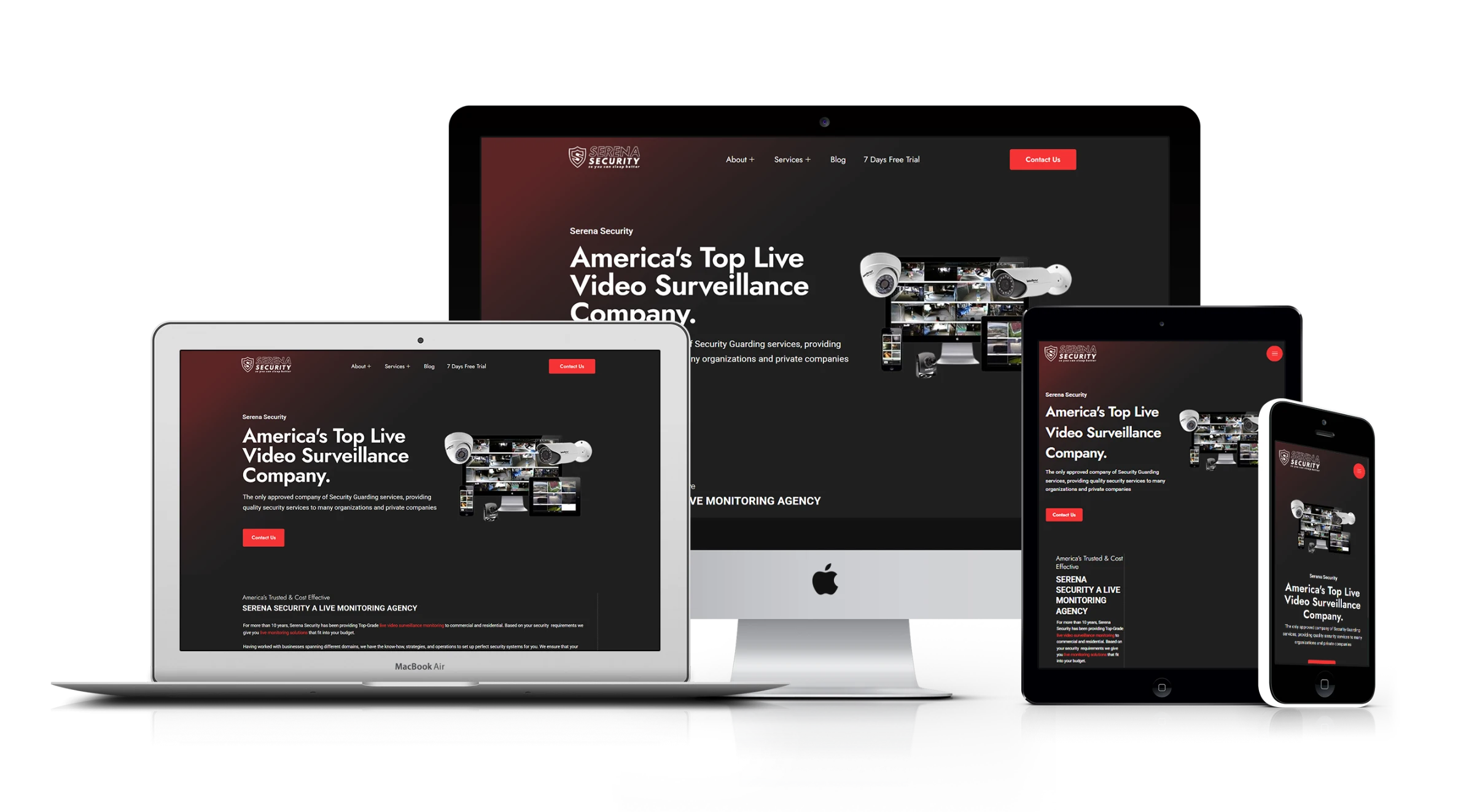 The website highlights services, trust signals, free trials, and clear contact paths, presenting Serena Security as a reliable, scalable security partner for businesses nationwide.